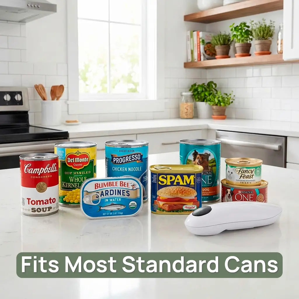 It works with most standard metal food cans — including round, oval, and rectangular shapes commonly found in American kitchens.